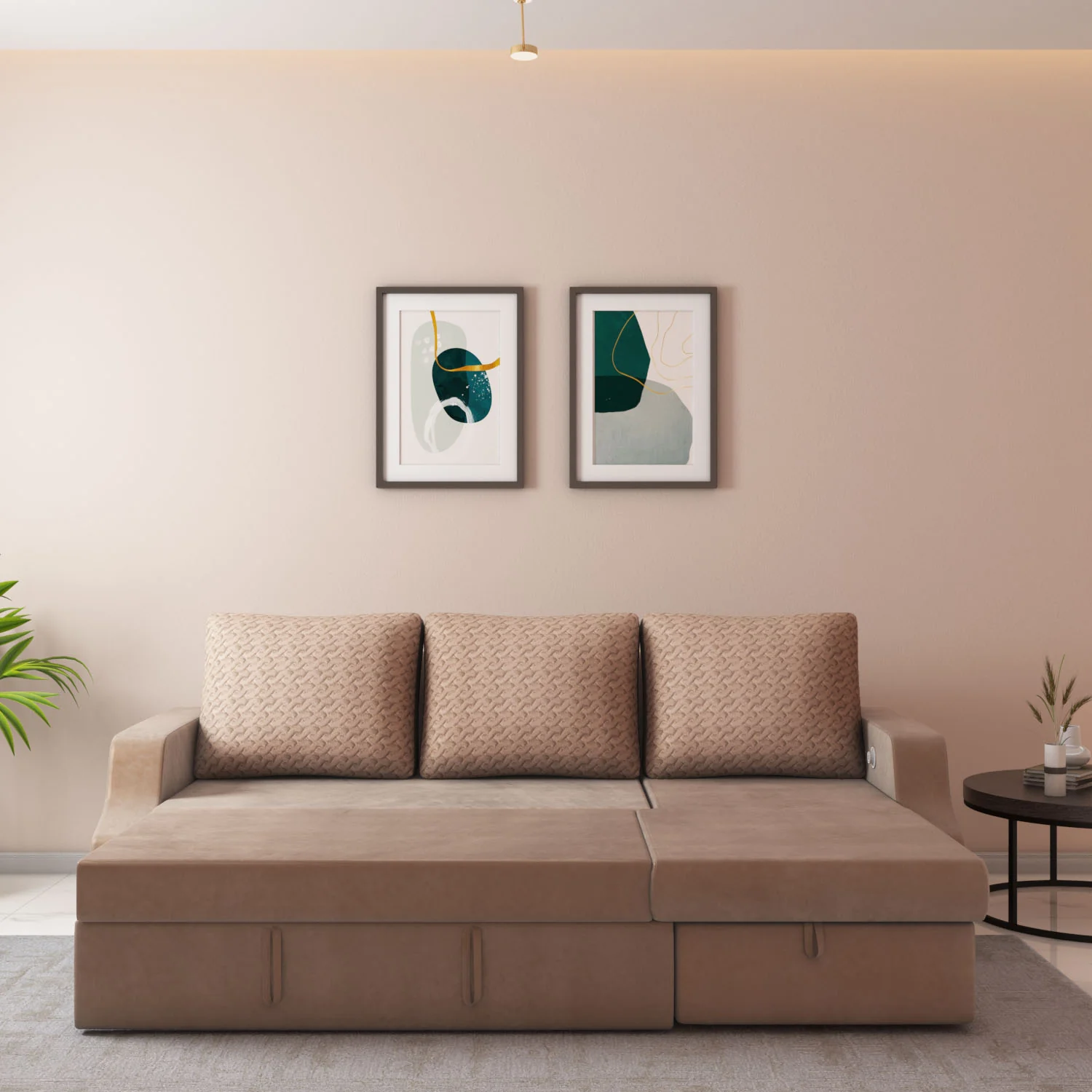 Portland Sofa Cum Bed With Left Lounger & Storage (Light Brown)